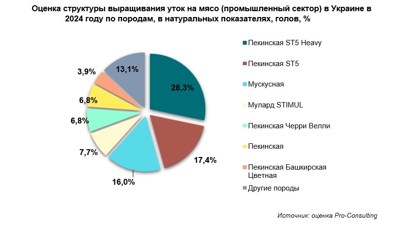 1. Структура выращивания уток на мясо (промышленный сектор) в Украине в 2024 году по породам, в натуральных показателях, голов, %