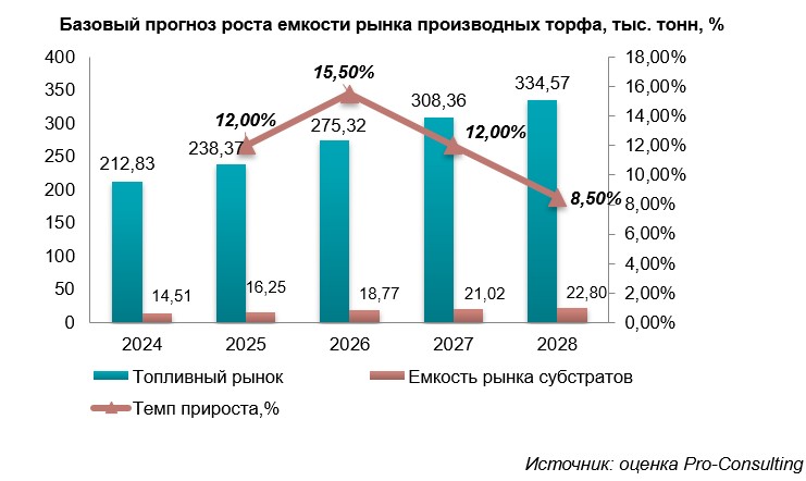 Темп прироста прогнозируется одинаковым для рынков торфяного субстрата и топливного торфа из-за идентичности факторов, влияющих на развитие этих сфер.