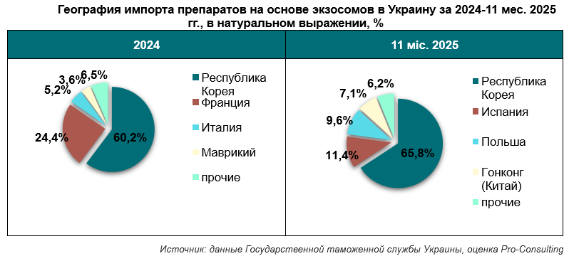 Аналитиками компании Pro-Consulting был проведен анализ импорта препаратов на основе экзосом, которые поставлялись в Украину в течение 2024-2025 годов (11 мес.). Анализ данных показал, что в страну импортируются препараты по уходу за кожей и восстановления волос в различных видах (кремы, тонеры, маски, патчи, сыворотки и др.). Преобладающая часть продукции имеет происхождение из Республики Корея.