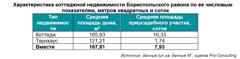 3. Характеристика коттеджной недвижимости* Бориспольского района по ее числовым показателям, метров квадратных и соток