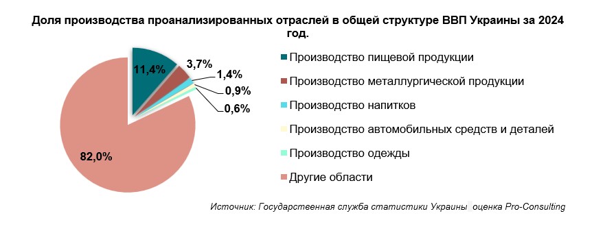 1. Доля производства проанализированных отраслей в общей структуре ВВП Украины за 2024 год.