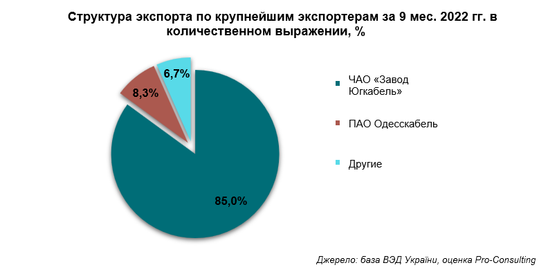 Крупнейшими экспортерами высоковольтных кабелей в Украине остаются ОАО «Завод Южкабель» и ОАО «Одескабель». Изменилась география экспорта продукции из Украины: к 2022 году основные объемы поставлялись в Молдову и беларусь, пока сотрудничество с беларусью прекращено.