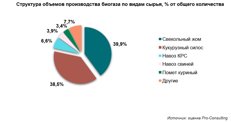 В Украине перечень видов сырья, используемого для производства биогаза, ограничивается 5 основными видами, а именно: навоз свиней, навоз КРС, помет куриный, жом сахарной свеклы и силос кукурузы. По оценке UABIO суммарное потребление данных видов сырья составляет около 97% по свежей массе. Наибольший объем биогаза на начало 2022 года производился из жома сахарной свеклы и силоса кукурузы. В сравнительно незначительных количествах также используется половая зерновая, меласса, жировые флотошламы и некоторые другие виды сырья.