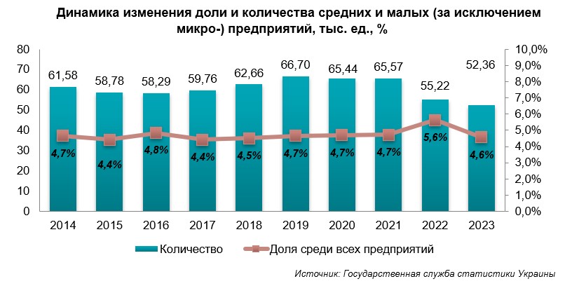 Согласно данным Государственной службы статистики, за 2023 год произошло уменьшение общего количества представителей малого и среднего бизнеса и их доли в общей сумме субъектов хозяйствования, что негативно влияет на общую тенденцию исследуемого рынка.