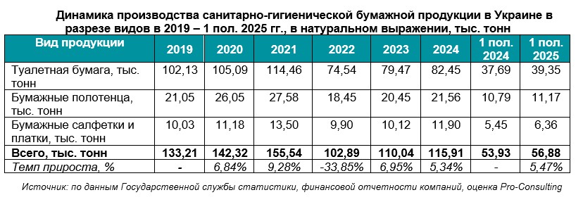 За первое полугодие 2025 года по отношению к соответствующему периоду 2024 года емкость рынка туалетной бумаги выросла на 4%, бумажных полотенец – упала на 5,5%, емкость рынка бумажных салфеток и платков выросла почти на 17% в натуральном выражении. Емкость рынка бумажной основы за указанный период выросла на четверть.