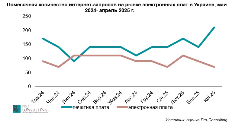 2. Помесячное количество интернет-запросов на рынке электронных плат в Украине, май 2024 – апрель 2025 г.