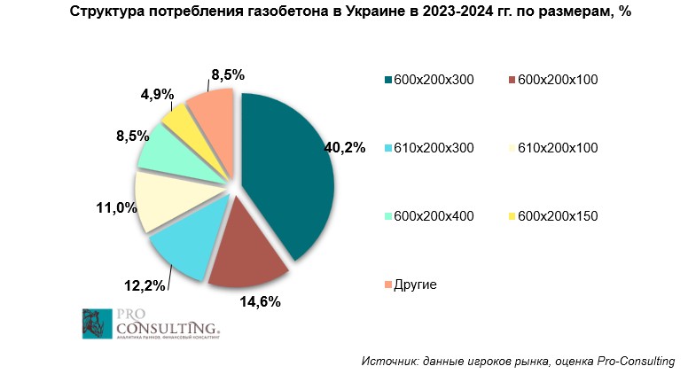 15. Структура потребления газобетона в Украине в 2023-2024 гг. по размерам, %