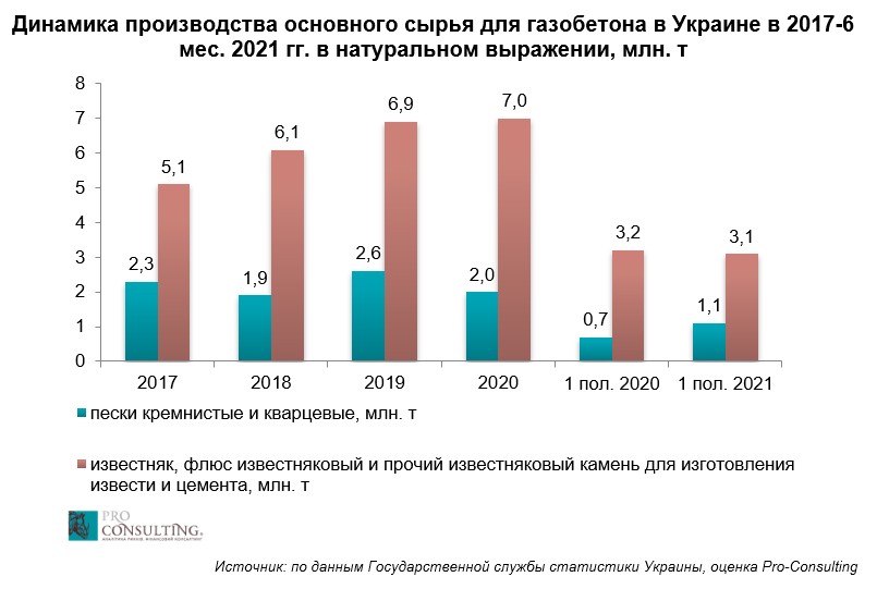 Украинский рынок газобетона обеспечен полностью сырьевой базой для производства этого строительного материала. Среднегодовой прирост песка и известняка за 3 года составлял 8,7% и 7,1%.