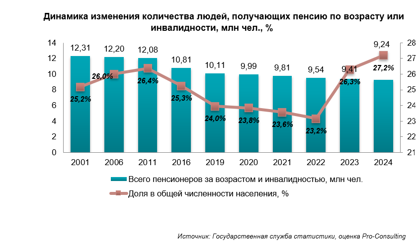 2. Динамика изменения количества людей, получающих пенсию по возрасту или инвалидности, млн чел., %