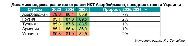 Индекс развития ИКТ Азербайджана составляет 85,9 пунктов в 2025 году, что меньше соседних Грузии, Армении и Турции, однако демонстрирует наибольший прирост за 2025/2024 годы в 7%.