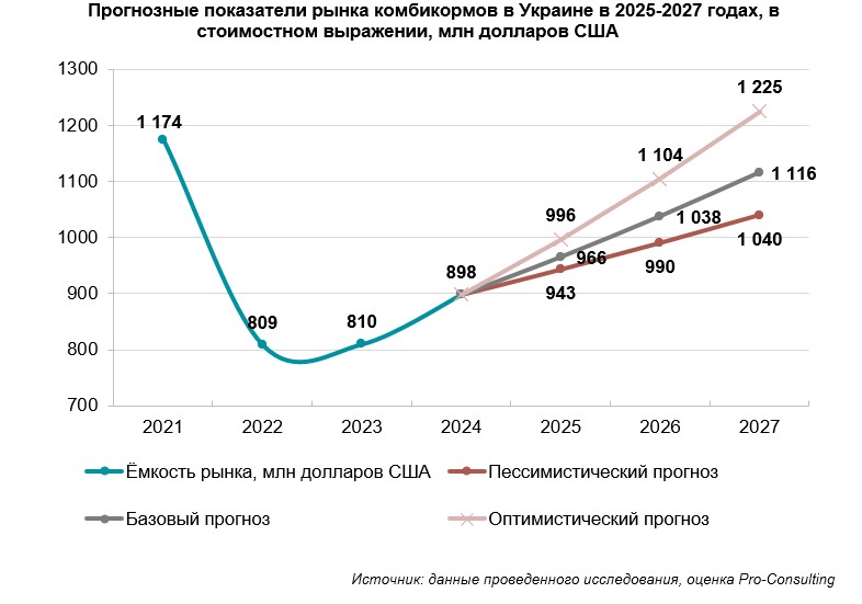 19. Прогнозные показатели рынка комбикормов в Украине в 2025-2027 годах, в стоимостном выражении, млн долларов США
