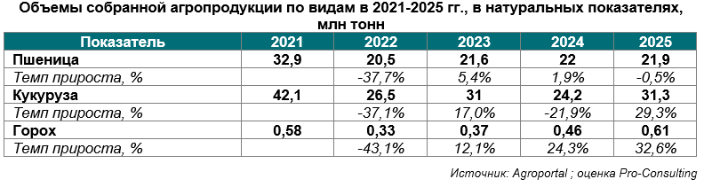 2. Объемы собранной агропродукции по видам в 2021-2025 гг., в натуральных показателях, млн тонн