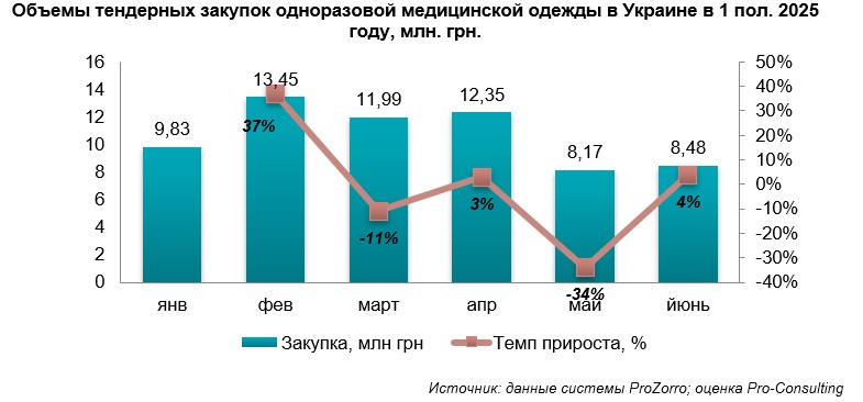 3. Объемы тендерных закупок одноразовой медицинской одежды в Украине в 1 пол. 2025 году, млн. грн.