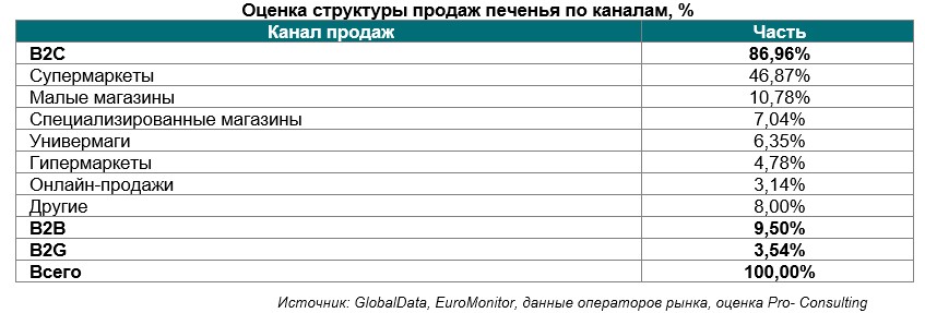 Каналы сбыта Основным каналом сбыта остаются супермаркеты, являющиеся главным источником приобретения продуктов питания для большинства потребителей. Значительную долю занимают магазины в малых городах и селах, а также специализированные магазины – кондитерские и фирменные точки от операторов. Несмотря на малую часть, B2B и B2G-сегменты остаются перспективными направлениями развития.