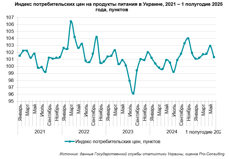 3. Индекс потребительских цен на продукты питания в Украине, 2021 – 1 полугодие 2025 года, пунктов