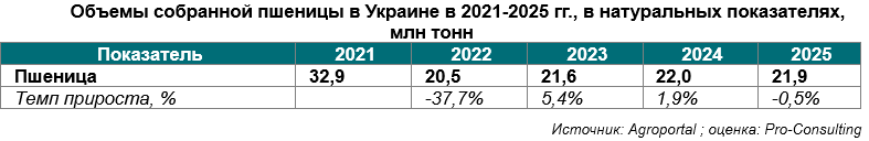 1. Объемы собранной пшеницы в Украине в 2021-2025 гг., в натуральных показателях, млн тонн