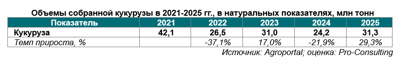 2. Объемы собранной кукурузы в 2021-2025 гг., в натуральных показателях, млн тонн