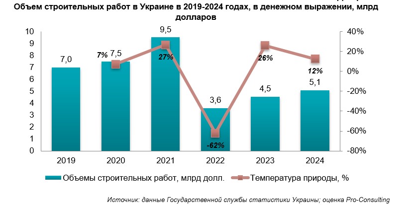 5. Объем строительных работ в Украине в 2019-2024 годах, в денежном выражении, млрд долларов