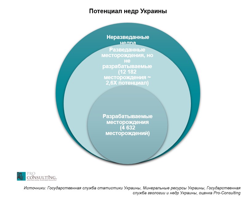 В Украине насчитывается около 12,2 тыс. разведанных месторождений полезных ископаемых (в том числе комплексные месторождения), однако только 4,6 тыс. из них разрабатываются. Кроме того, обоснована вероятность наличия новых месторождений полезных ископаемых.