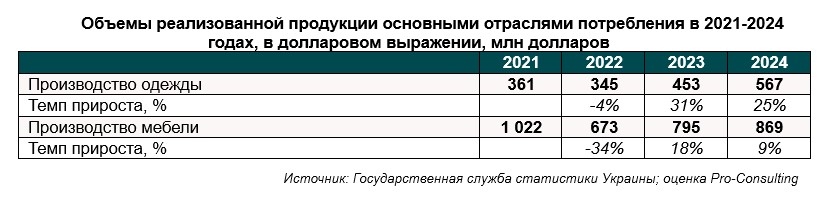 В то же время, производство мебели возобновилось после резкого падения в 2022 году: после снижения объемов с 1 022 млн дол. в 2021 году до 673 млн. дол. в 2022 году оно выросло до 795 млн дол. в 2023 году и до 869 млн. дол. в 2024 году.