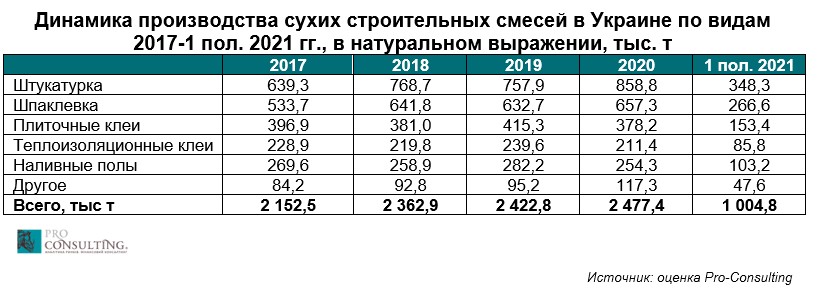 5. Динамика производства сухих строительных смесей в Украине по видам 2017-1 пол. 2021 гг., в натуральном выражении, тыс. т