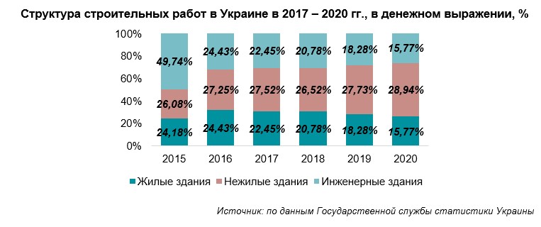 В структуре строительных работ преобладают инженерные постройки. Такие проекты обычно имеют очень большие масштабы, нуждаются в сложных решениях, существуют в единственном экземпляре и не похожи на другие сооружения. Это значительно поднимает цену таких проектов. Доля инфраструктурных проектов с возрастом возрастает, что увеличивает спрос на продукцию с особенными чертами.