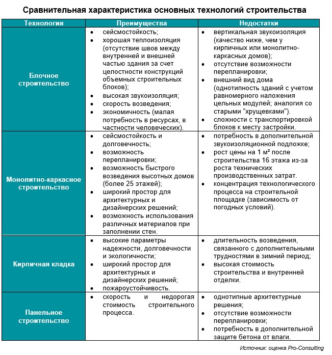 Последние несколько лет среди используемых строительных технологий преобладает монолитно-каркасное строительство. Оно применяется как в массовой застройке, так и при создании уникальных проектов элитных ЖК. Также не теряет своих позиций технология кирпичной кладки. Панельные дома среди новостроек встречаются крайне редко, исключительно в "эконом" сегменте, который также уменьшается с каждым годом, все больше уступая "комфорту" сегменту. В общем, все перечисленные технологии имеют свои преимущества и недостатки.