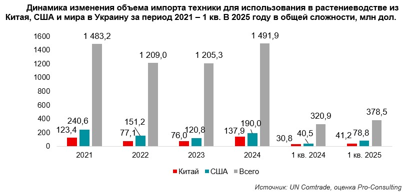 21. Динамика изменения объема импорта техники для использования в растениеводстве из Китая, США и мира в Украину за период 2021 – 1 кв. В 2025 году в общей сложности, млн дол.
