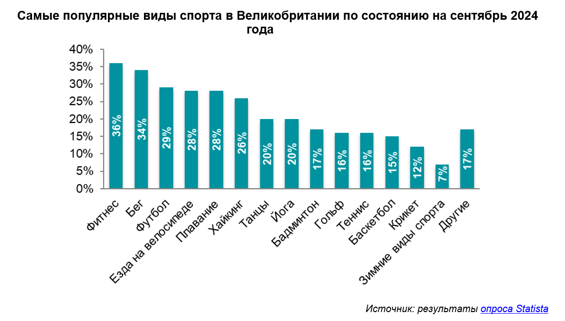 Диаграмма 1 Самые популярные виды спорта в Великобритании по состоянию на сентябрь 2024 года
