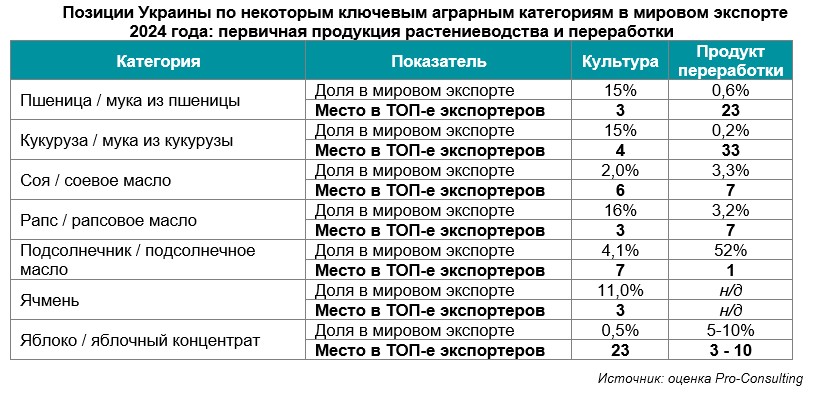 14. Позиции Украины по некоторым ключевым аграрным категориям в мировом экспорте 2024: первичная продукция растениеводства и переработки
