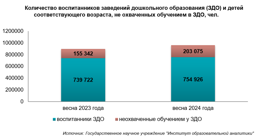 В детских садах за 2022 год число воспитанников упало на 33% (с 1 111 358 до 739 722), а в 2023 году незначительно увеличилось (+2%, до 754 926). Доля детей дошкольного возраста, не посещающих сады, выросла с 21% до 27%.