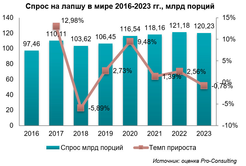 Глобальные тренды указывают на сдвиг в сторону более качественных и здоровых продуктов питания. Однако в Украине экономическая нестабильность, снижение доходов населения и военные реалии делают важным наличие доступной продукции рынка лапши быстрого приготовления.