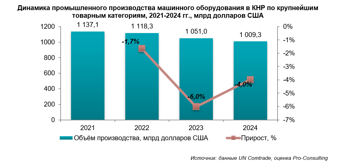 С 2021 по 2024 годы рынок столкнулся с замедлением темпов расширения. Денежный объем производства машинного оборудования снизился с $1137 млрд в 2021 году до $1009 млрд в 2024-м. Причинами стали: