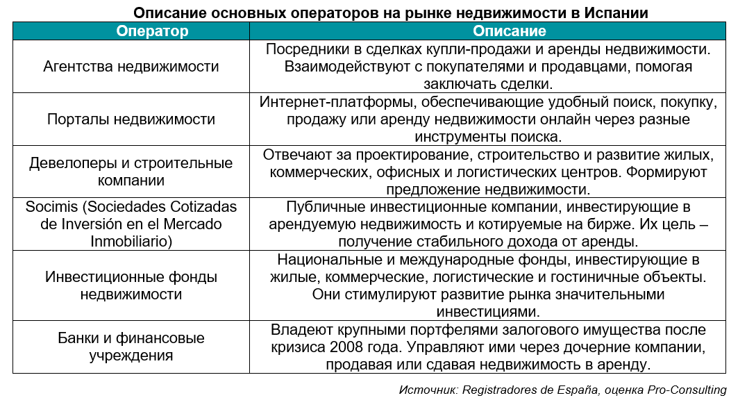 Ключевыми игроками выступают агентства недвижимости, девелоперы, строительные компании, инвестиционные фонды, публичные компании Socimis, а также банки, управляющие залоговыми активами.