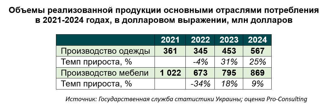 - Мебельное производство: после падения в 2022 году отрасль постепенно восстанавливается. Объемы выросли с 673 млн дол. до 869 млн дол. в 2024 году, что также стимулирует потребность в текстильных и швейных технологиях. Кстати, у Pro-Consulting есть уже готовый отчет по рынку мебели в Скандинавии – по аналогичной или скорректированной структуре мы может исследовать любой рынок мира или Украины.