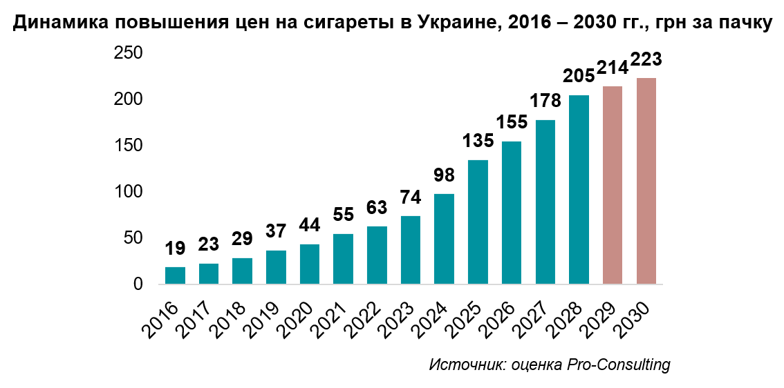 С 2016 по 2025 год цена пачки сигарет выросла с 19 до 135 грн, а к 2030 году прогнозируется рост до 223 грн. При неизменности доходов повышение цен оказывает давление на потребителей с низкой покупательной способностью. Это ведет к тенизации рынка и росту нелегальной торговли.