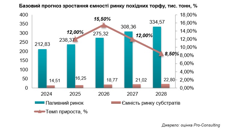 Темп приросту прогнозується однаковим для ринків торф'яного субстрату та паливного торфу з причини ідентичності факторів, що впливають на розвиток цих сфер.