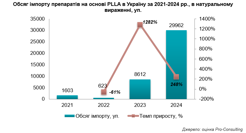 Обсяги імпорту препаратів PLLA демонструють значне зростання. Якщо у 2021 році імпорт становив 1603 упаковки, то вже у 2024 році цей показник досяг майже 30 тисяч упаковок. У грошовому еквіваленті це зростання від 5,5 млн грн у 2021 році до 85 млн грн у 2024 році.