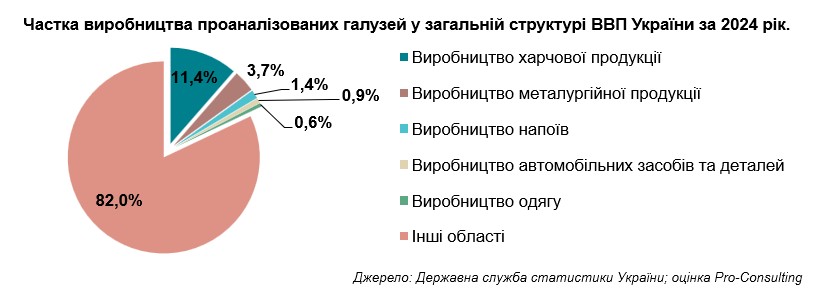 1. Частка виробництва проаналізованих галузей у загальній структурі ВВП України за 2024 рік.