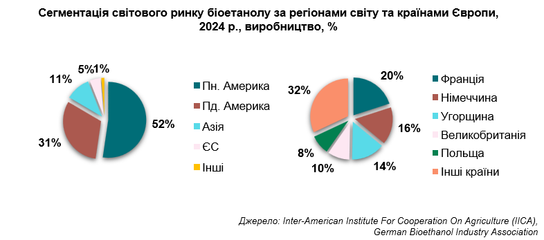 3. Сегментація світового ринку біоетанолу за регіонами світу та країнами Європи, 2024 р., виробництво, %