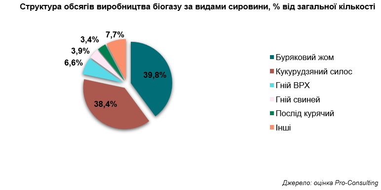 В Україні перелік видів сировини, що використовується для виробництва біогазу, обмежується 5 основними видами, а саме: гній свиней, гній ВРХ, послід курячий, жом цукрових буряків та силос кукурудзи. За оцінкою UABIO, сумарне споживання даних видів сировини складає близько 97% за свіжою масою. Найбільший обсяг біогазу станом на початок 2022 року вироблявся з жому цукрових буряків та силосу кукурудзи. У порівняно незначних кількостях також використовується полова зернових, меляса, жирові флотошлами та деякі інші види сировини.