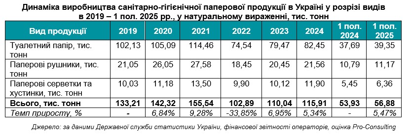 За перше півріччя 2025 року щодо відповідного періоду 2024 року ємність ринку туалетного паперу зросла на 4%, паперових рушників – впала на 5,5%, ємність ринку паперових серветок та хустинок зросла на майже 17% у натуральному вираженні. Ємність ринку паперової основи за зазначений період зросла на чверть.