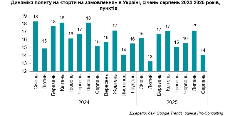 Виходячи з вищенаведеного, ринку властива сезонність: піки зацікавленості в тортах на замовленнях помітні в січні (святкування Різдва східного обряду), березні та квітні (Великдень), липні (літні відпустки), максимальні спади – в лютому (після новорічних свят) та листопаді (перед новорічними святами).