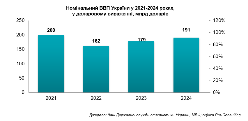1. Номінальний ВВП України у 2021-2024 роках, у доларовому вираженні, млрд доларів