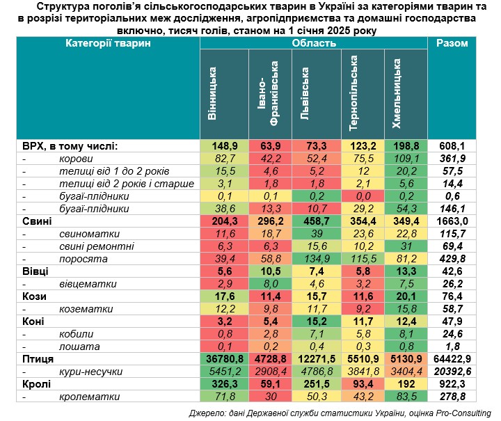 3. Структура поголів’я сільськогосподарських тварин в Україні за категоріями тварин та в розрізі територіальних меж дослідження, агропідприємства та домашні господарства включно, тисяч голів, станом на 1 січня 2025 року