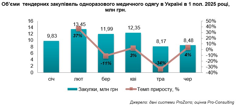 У першій половині 2025 року загальний обсяг тендерів досяг 64,1 млн грн, що майже вдвічі перевищує показники за аналогічний звітний період 2024 року. Зростання зумовлене як перенесенням частини процедур із кінця 2024 року, так і стабільно високим попитом з боку медичних закладів. Особливо це стосується засобів індивідуального захисту для медичного персоналу.