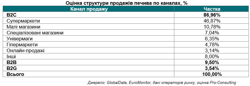 Канали збуту Основним каналом збуту залишаються супермаркети, які є головним джерелом придбання продуктів харчування для більшості споживачів. Значну частку займають також магазини у малих містах та селах, а також спеціалізовані магазини – кондитерські та фірмові точки від операторів. Попри малу частку, B2B та B2G-сегменти залишаються перспективними напрямками розвитку.