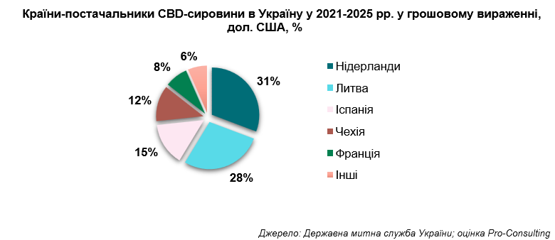 Ринок CBD-продуктів в Україні є відносно новим, його сплеск спостерігається з адаптацією законодавства до існуючих практик в країнах ЄС. За оцінкою Pro-Consulting, обсяг роздрібного ринку в 2025 році у грошовому вираженні може становити понад 400-420 млн грн (понад 10 млн доларів), у натуральному ~22 тонни (CBD-олії – ~12 т, желейки – ~5 т, капсули і таблетки – ~5 т).