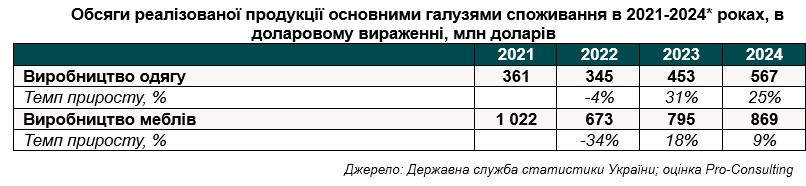 Водночас виробництво меблів відновилося після різкого падіння в 2022 році: після зниження обсягів із 1 022 млн дол. у 2021 році до 673 млн дол. у 2022 році воно виросло до 795 млн дол. у 2023 році та до 869 млн дол. у 2024 році.