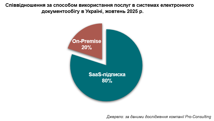 Кількісне співвідношення за способом використання послуг приблизно 80/20 на користь SaaS, де 80% — це масовий ринок (малий і середній бізнес, за спеціалізацією – ритейл і логістика), що використовує підписки, а 20% — ніша держустанов, структур оборони та безпеки, ВПК, підприємств стратегічної промисловості та великих корпорацій, де використовуються On-Premise або змішані моделі.